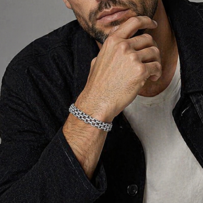 Stilrent armbånd med sølvtonede tætte led der giver fylde på håndleddet uden at virke for markant.