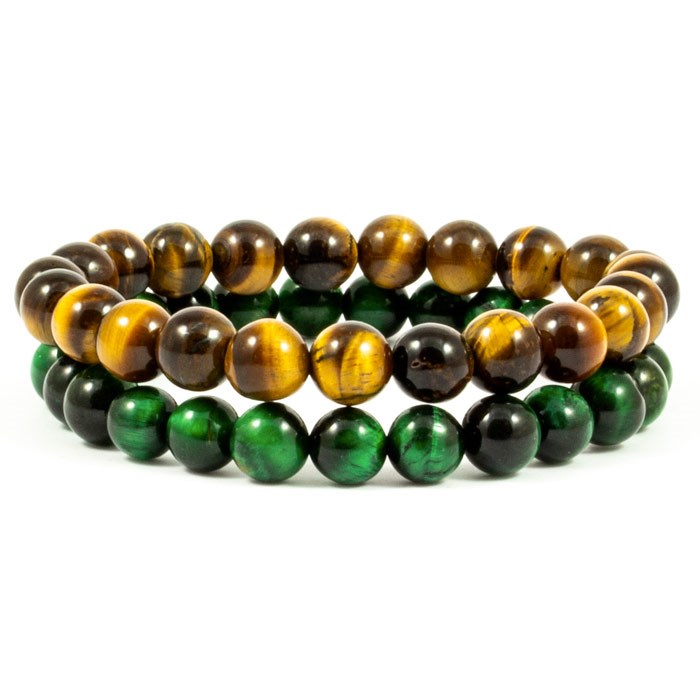 Et smart sæt der består af 2 armbånd designet med grønne og brune tiger eye sten.