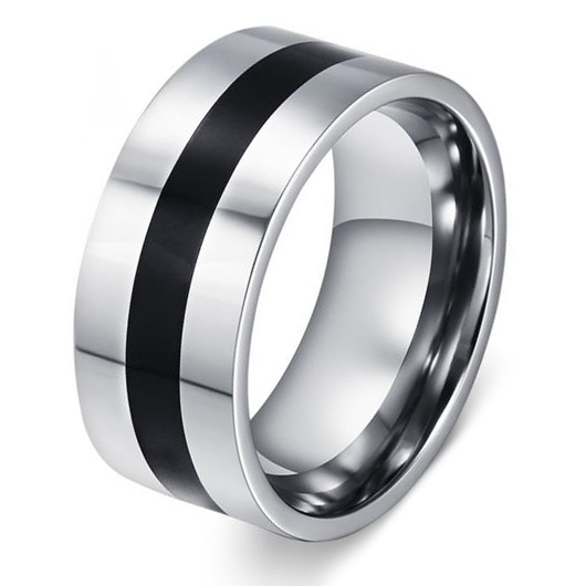 En moderne herre ring i blank poleret stål designet med en sort centreret stribe.