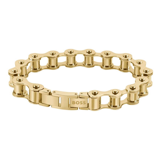 Giv din stil et unikt præg med dette guldfarvede stål armbånd fra BOSS, der er designet som en cykelkæde. Dette elegante og originale armbånd kombinerer luksus med et råt twist og er det perfekte accessorie for dem, der ønsker at udstråle individualitet og klasse. Uanset om du er på arbejde eller ude i byen, vil dette BOSS armbånd få dig til at skille dig ud med stil og elegance.