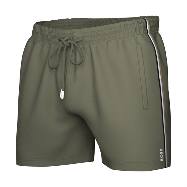 Optjen blikfang ved stranden med disse beige/khaki farvede badeshorts fra BOSS. Den elegante farvetone kombineret med en smal logo-stripe ned langs benene skaber en harmonisk fusion af stil og komfort.
