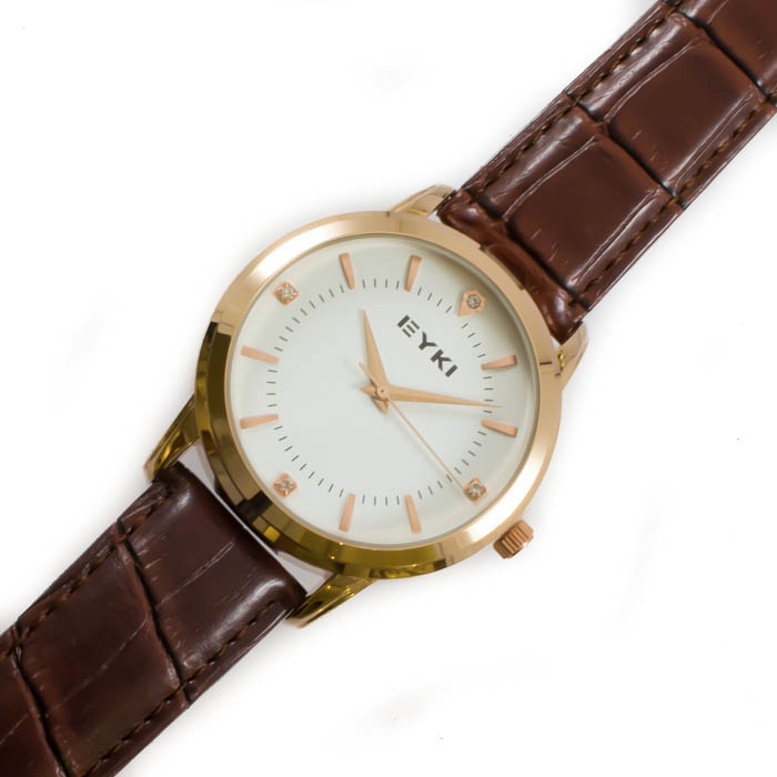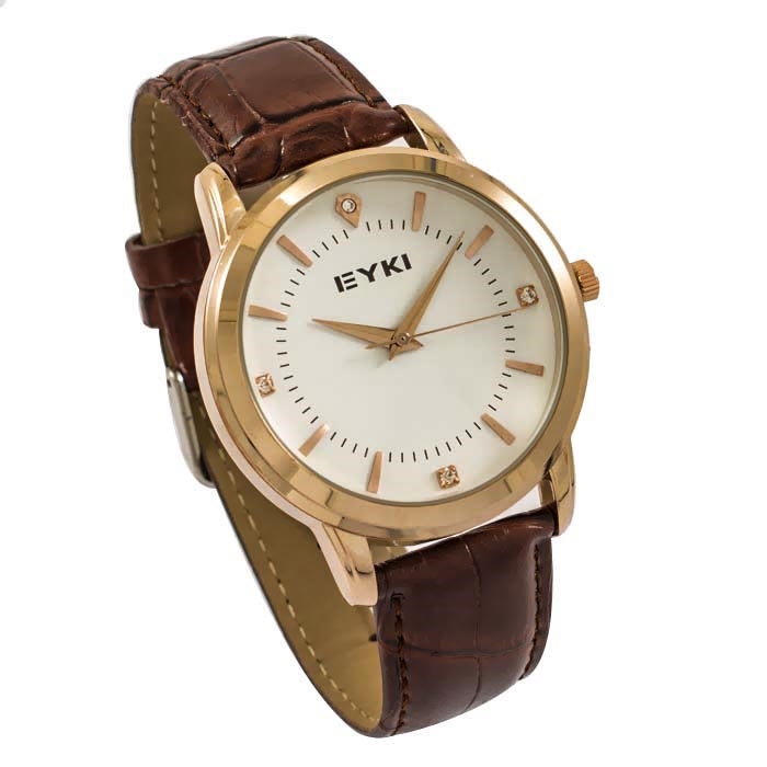 Herreur i mærket Eyki. Uret er udstyret med en fornem nøddebrun læderrem, samt et flot rødguldfarvet urhus der passer til. Urskiven er i en hvid farve, med  guldfarvet visere der passer dertil. Dette ur er virkelig beundringsværdigt, pga. dets stilrene design. Meget flot klassisk ur som kan bruges af alle.