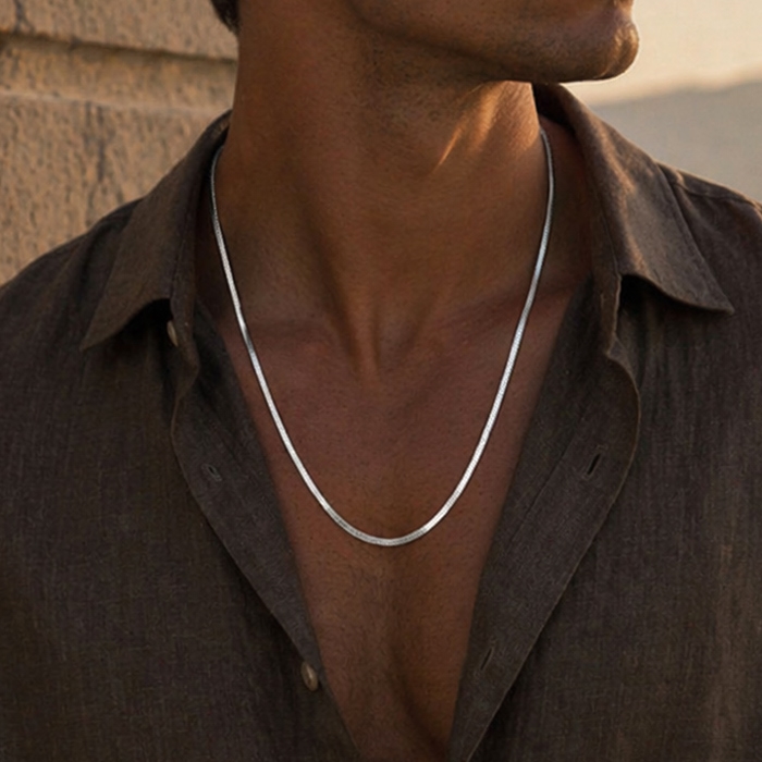 En lækker halskæde med tætte led der med sin blanke overflade syner af noget uden at virke for markant.
