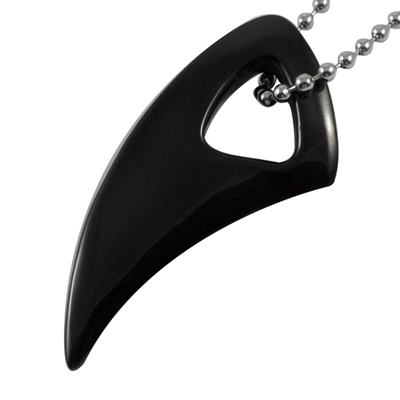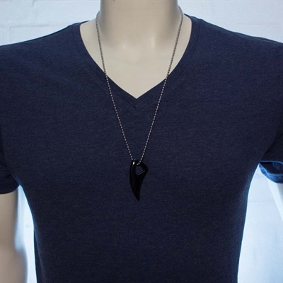 En halskæde til mænd, med et vedhæng formet som en haj tand i sort blank poleret 316L stål.
