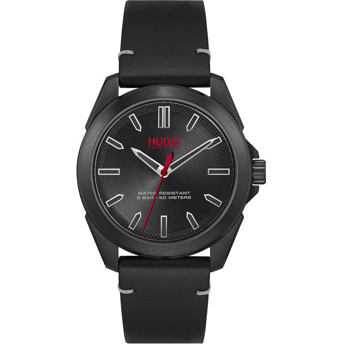 Lækkert og maskulint herreur fra HUGO med sort urkasse i stål, sort skive og sort læderrem.