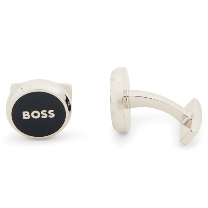 BOSS manchetknapper - den ultimative finish til din skjorteærme. Giv dit look et raffineret og stilfuldt pift med disse elegante accessories. Manchetknapperne er har et rundt design i sølvtone med BOSS-logoet elegant placeret på en sort bagrund.