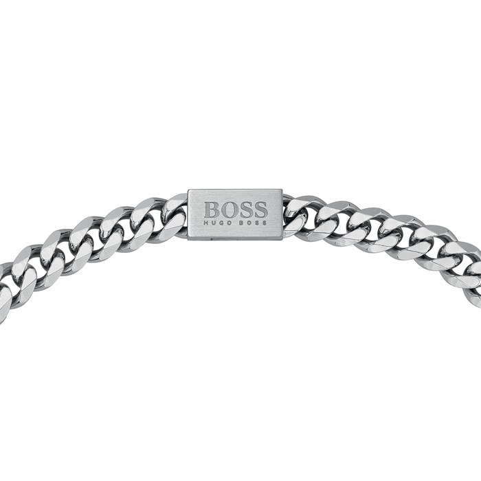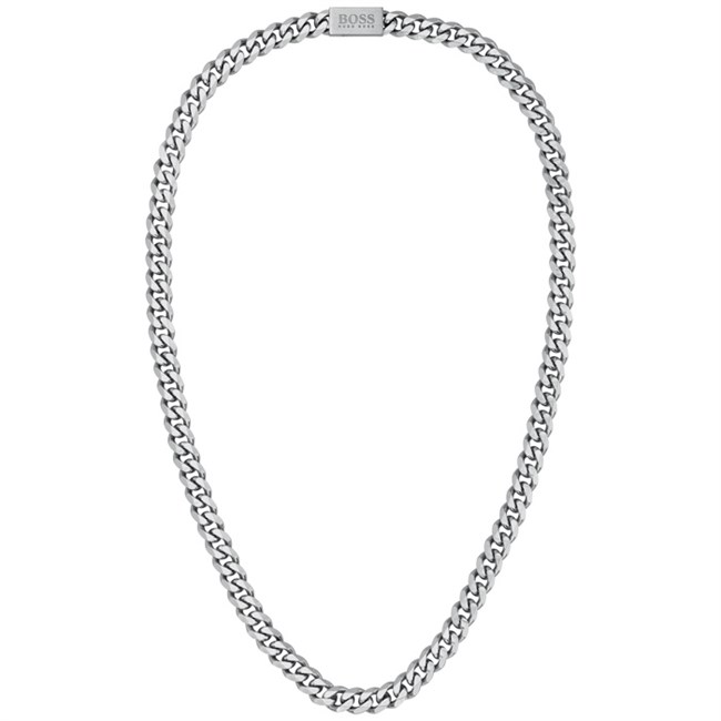 Stilren og eksklusiv halskæde fra Hugo Boss designet med facet skårede stål led og en mat slebet magnet lås med stift som er præget med Hugo Boss logoet.