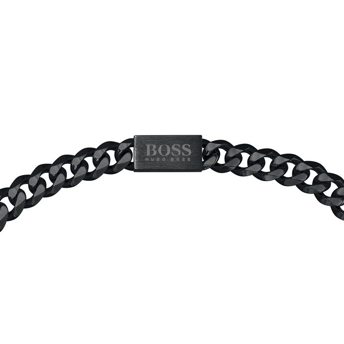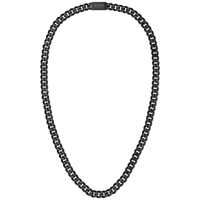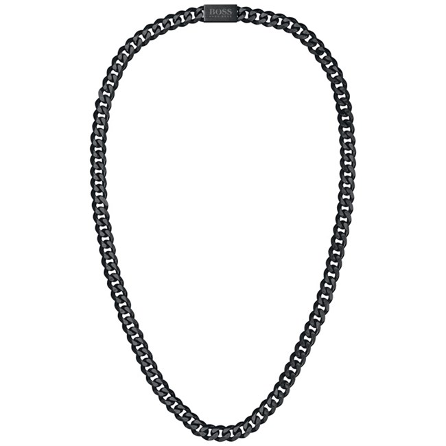 Stilren og eksklusiv halskæde fra Hugo Boss designet med sorte facet skårede stål led og en mat slebet magnet lås med stift som er præget med Hugo Boss logoet.