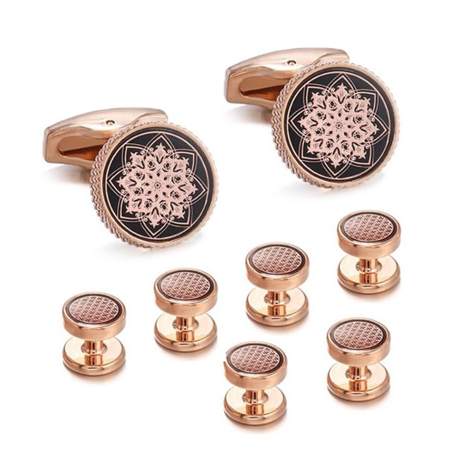 Et lækkert sæt manchet og brystknapper med et eksklusivt udtryk i et rosegold design med mønster.