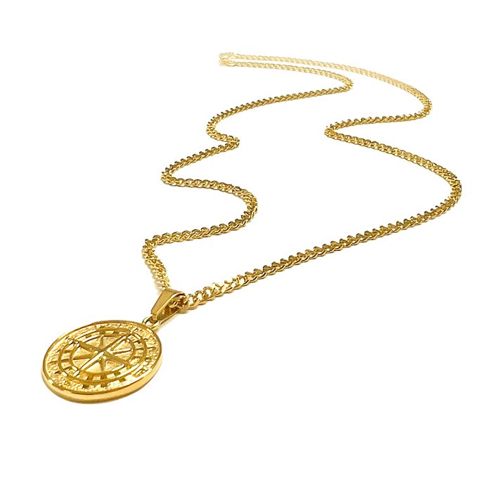 En stilren og enkel halskæde med et rustikt kompas i et guldtonet design med stål kæde, et smykke der har et casual udtryk uden at virke for markant.