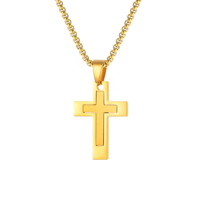 En lækker guldtonet korshalskæde med et to-tonet design hvor centerdelen af korset er mat og yderkanterne er blankpoleret.