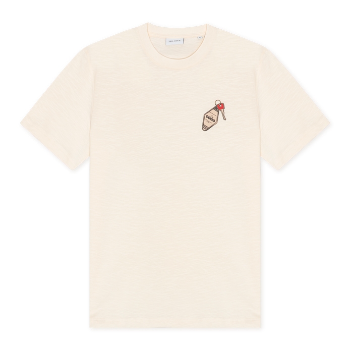 Moderne beige t-shirt med ikonisk logo på brystet fra Les DeuxModerne beige t-shirt med ikonisk logo på brystet fra Les Deux