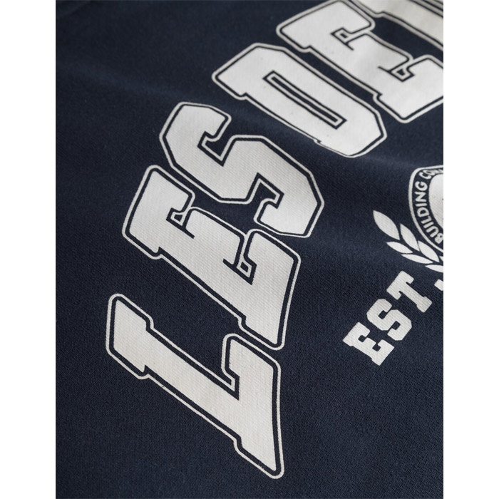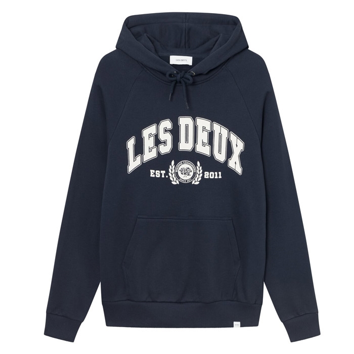 Forestil dig at trække denne hoodie fra Les Deux over hovedet og føle den bløde bomuld omslutte dig i ren luksus. Den mørkeblå farve tilføjer et strejf af elegance, mens det hvide 90'er inspirerede logo print hen over brystet giver dig den perfekte dose af retro coolness.