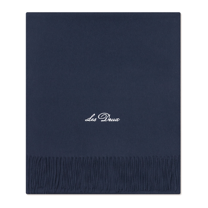 Klassisk stilrent tørklæde i mørkeblå fra Les Deux med broderet kursiv logoKlassisk stilrent tørklæde i mørkeblå fra Les Deux med broderet kursiv logo