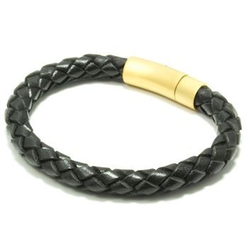 Et klassisk sort flettet læderarmbånd af gennemfarvet boloflettet læder, med en kraftig rund bajonet lås i mat guldfarvet stål.