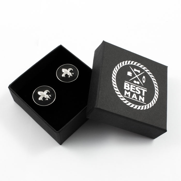 Et specielt og unikt sæt manchetknapper i sort og sølv, der i sin form af et skjold, virkelig skiller sig ud fra de gængse manchetknapper.