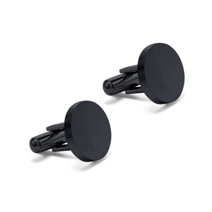 Runde sorte manchetknapper designet med en let mat slebet overflade.