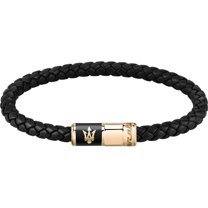 Lækkert sort flettet læder armbånd med flot guldfarvet lås med logo fra Maserati.