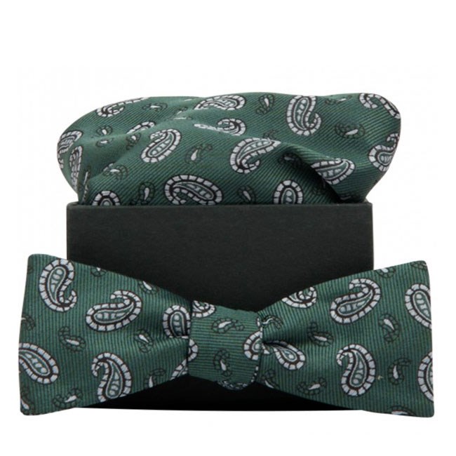 Stilfuld mønstret bundet butterfly fra Connexion i 100% Recycled Polyester i grøn, hvid, sort med matchende pynteklud som leveres i æske.