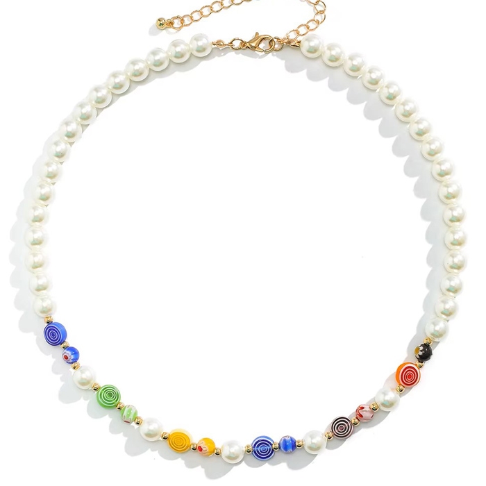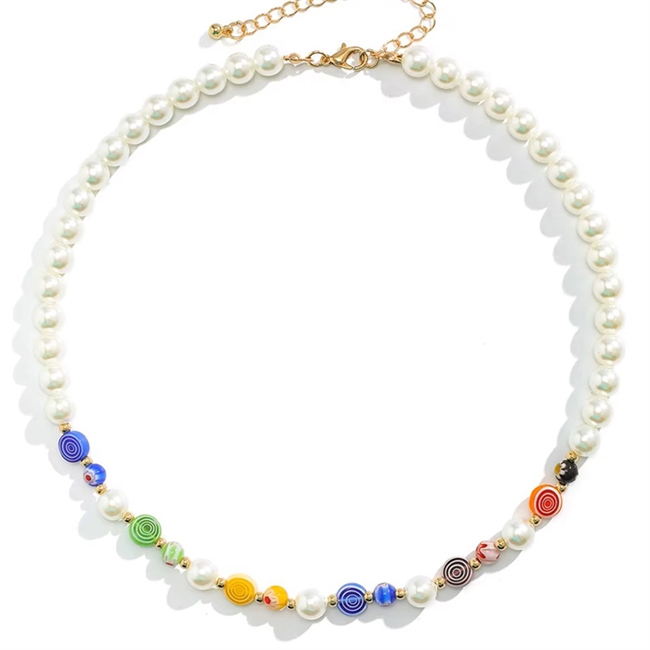 Lækker perlehalskæde designet med primært hvide og flerfarvede perler.