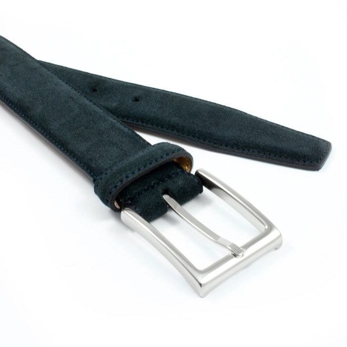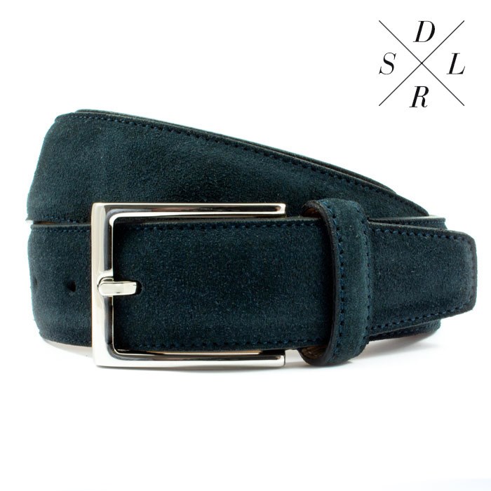 Moderne og trendy ruskinds bælte fra Saddler designet i en mørkeblå farve med kantsyninger.