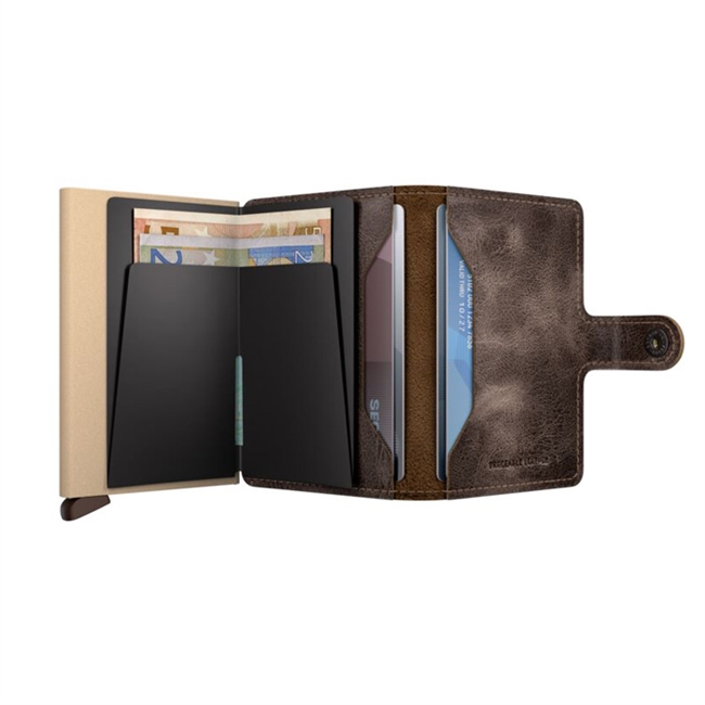 Smart Secrid miniwallet kortholder designet med et vintage brunt udtryk i læderet og en pulvercoated cardprotector.