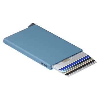 En lækker himmelblå pulverlakeret kortholder fra Secrid. Kortholderen er udstyret med Secrid's kendte og funktionelle knap i bunden, hvor man med et let tryk, skubber kortene ud af kortholderen, for nemt at kunne vælge det kort man skal bruge.