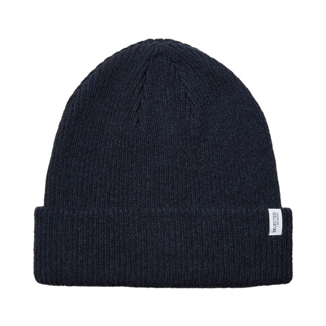 Super blød og varm strikket hue fra Selected i mørkeblå med lille logo.