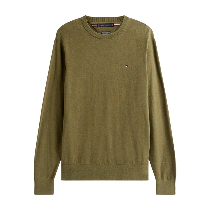 Lækker mørkegrøn crew neck strik i materialet casmereuld og bomuld fra Tommy Hilfiger