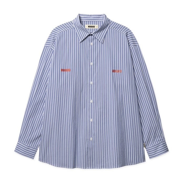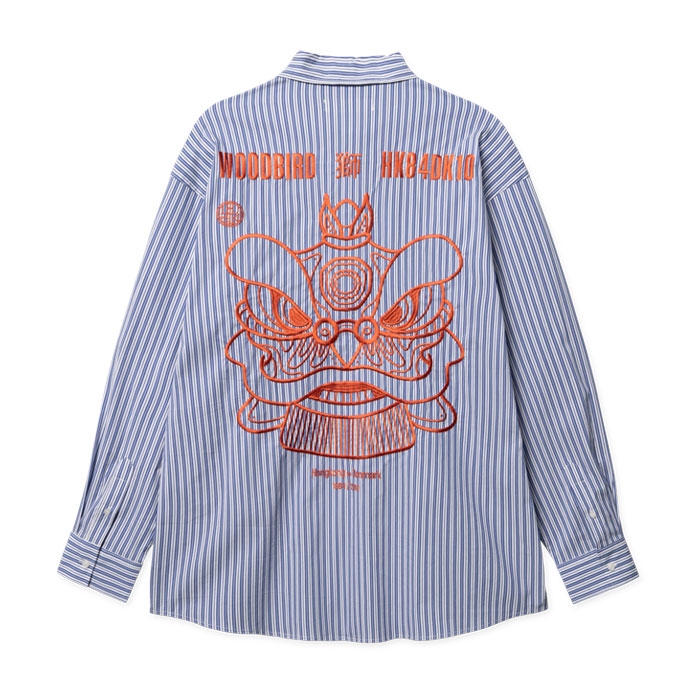 Moderne stribet skjorte i blå med broderet print på ryggen fra WoodbirdModerne stribet skjorte i blå med broderet print på ryggen fra WoodbirdModerne stribet skjorte i blå med broderet print på ryggen fra Woodbird