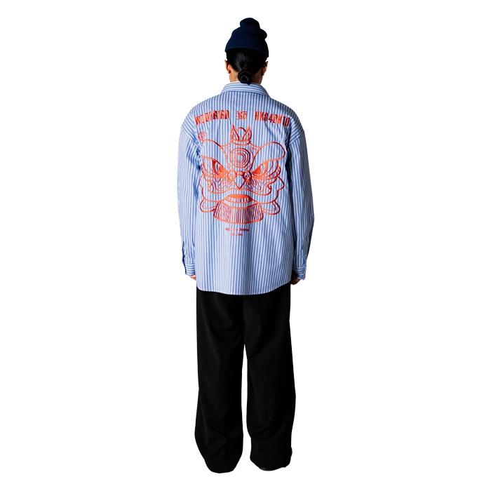 Moderne stribet skjorte i blå med broderet print på ryggen fra Woodbird